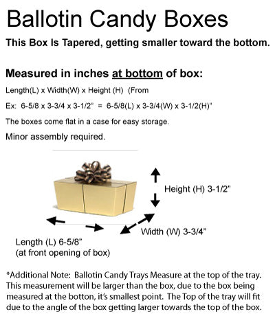 Ballotin Boxes are a folding candy box that tapers, getting smaller at the bottom. The box's measurements are at the bottom of the box.