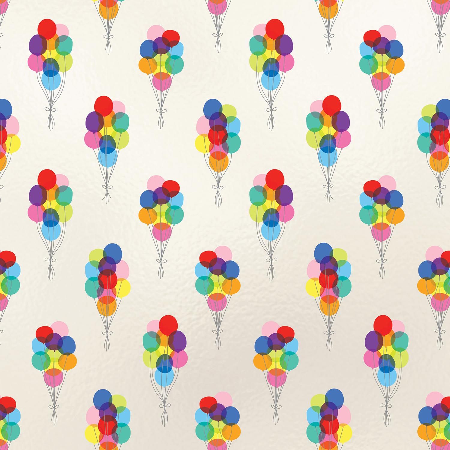 Our Bunch of Balloons Collection features Gift Bags, Wrapping Paper, Shipping Boxes, and Mailers in a white background and a pattern of rainbow balloon bunches across the front. Our bags also feature matte, holographic, and an inside print.