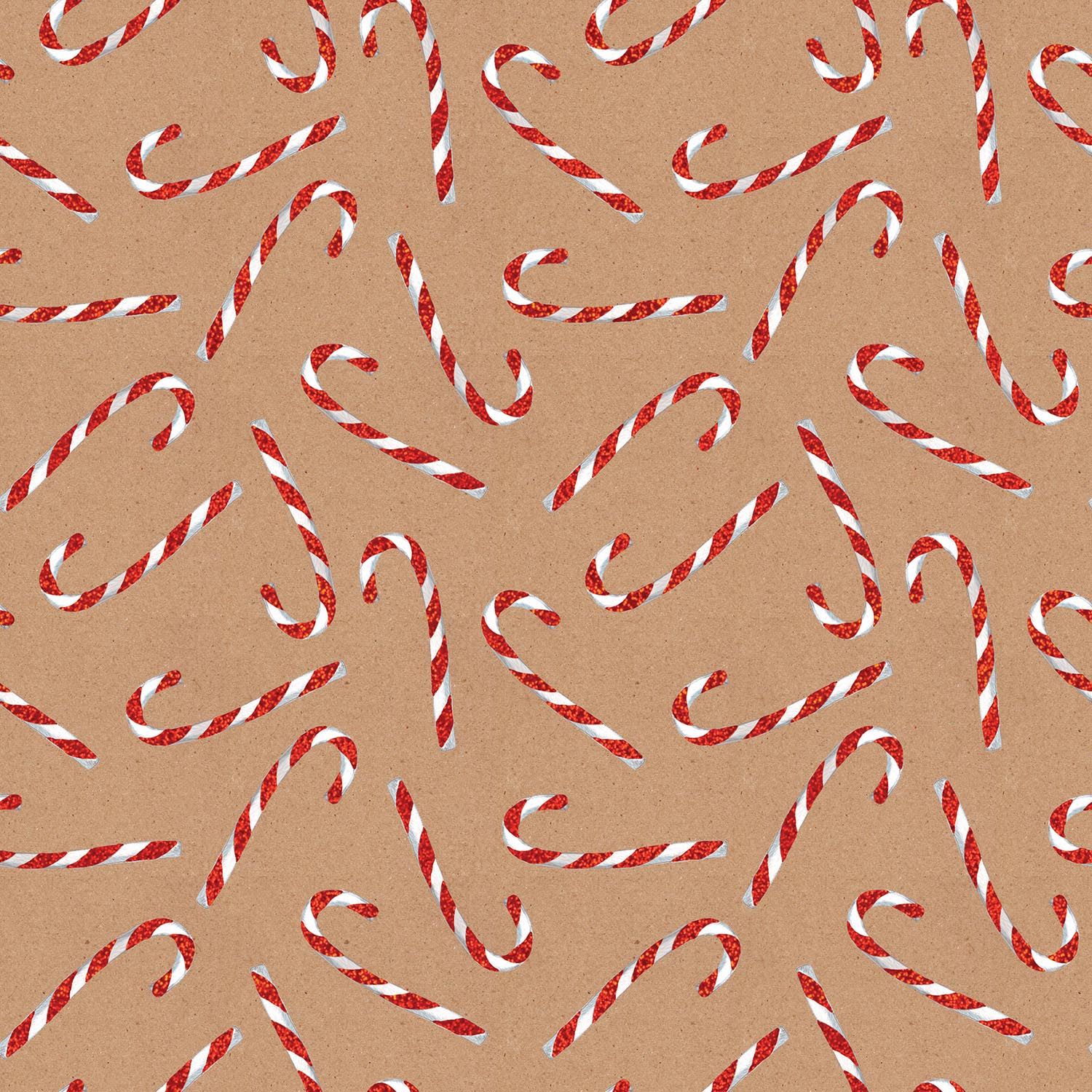 Our Candy Cane Glitter Gift Bags & Wrap Christmas Collection features Candy canes scattered on a natural kraft paper background, giving a rustic yet festive look with a classic holiday treat motif.