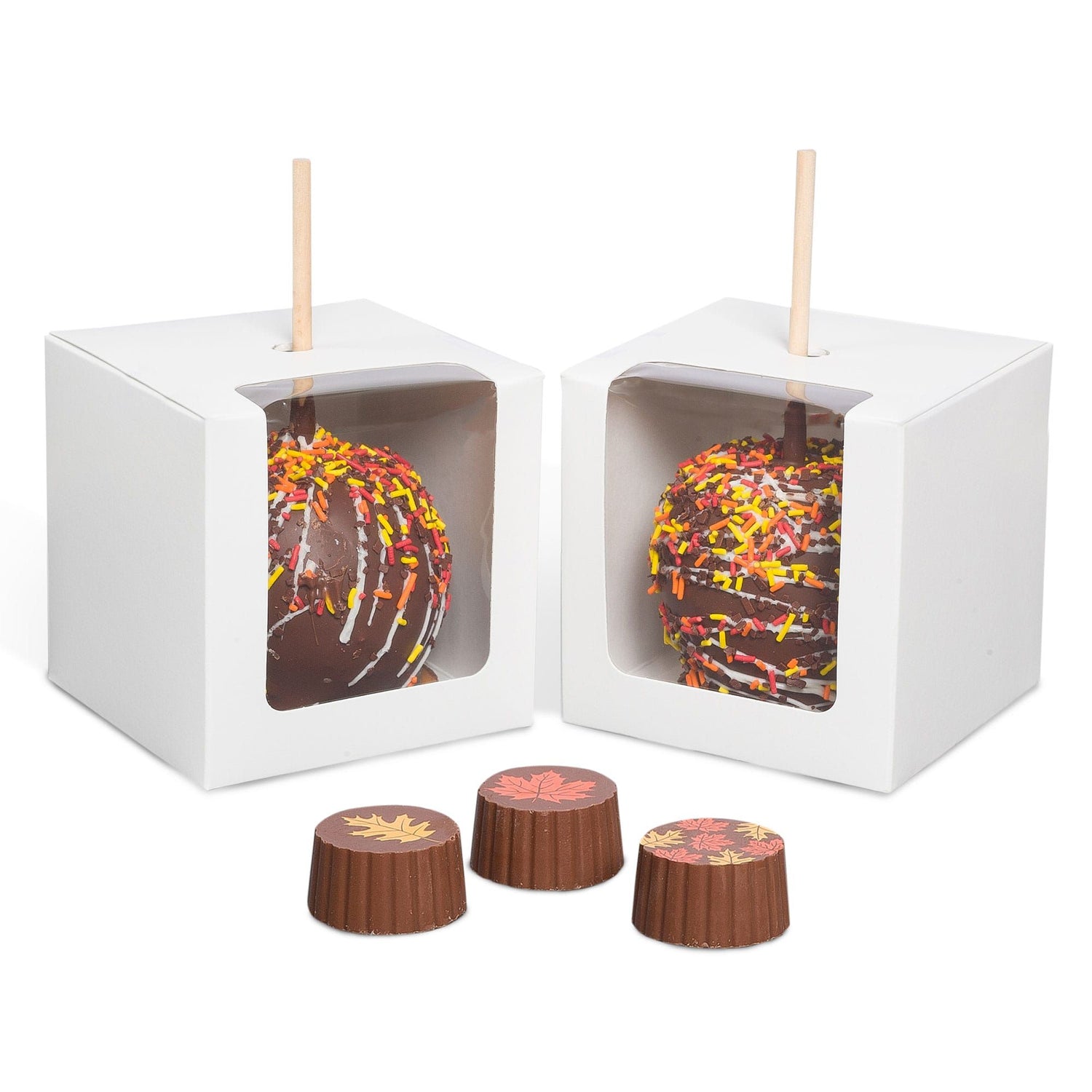 These boxes are one-piece and measure 4x4x4". The top panel has 7/16" perforation to accommodate a candy apple stick. Available designs include White, Red, a Green Apple design, and a Red Apple design. To use, feed the holding stick through the perforation in the lid, then set the apple in the box. Then just close the lid! These boxes are perfect for Fall, those selling at farmers markets, or apple orchards.