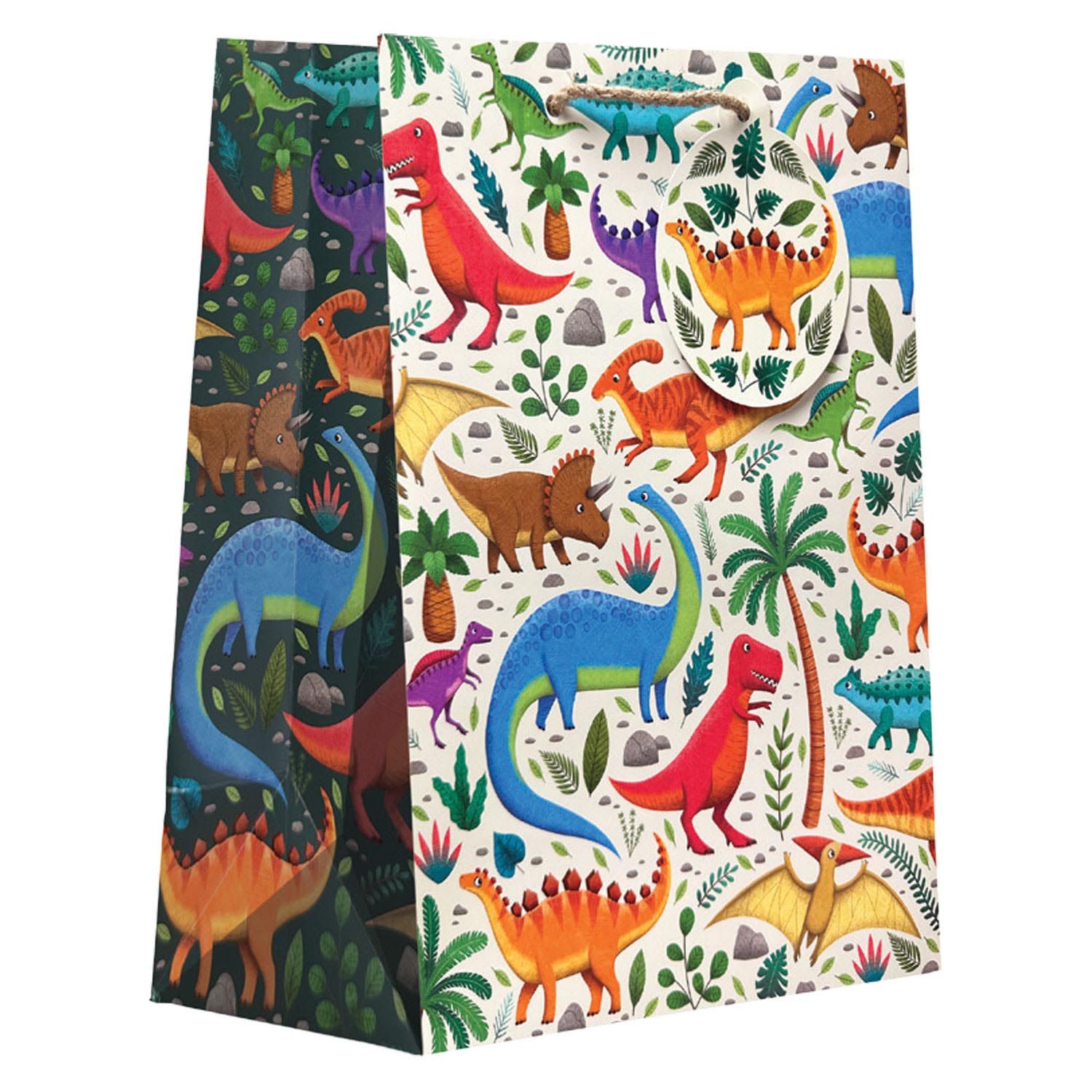 Our Dinosaurs Gift Bag collection has a design of different colored Dinosaurs and palm trees throughout. Our bags also feature matte, spot gloss, and an inside print.