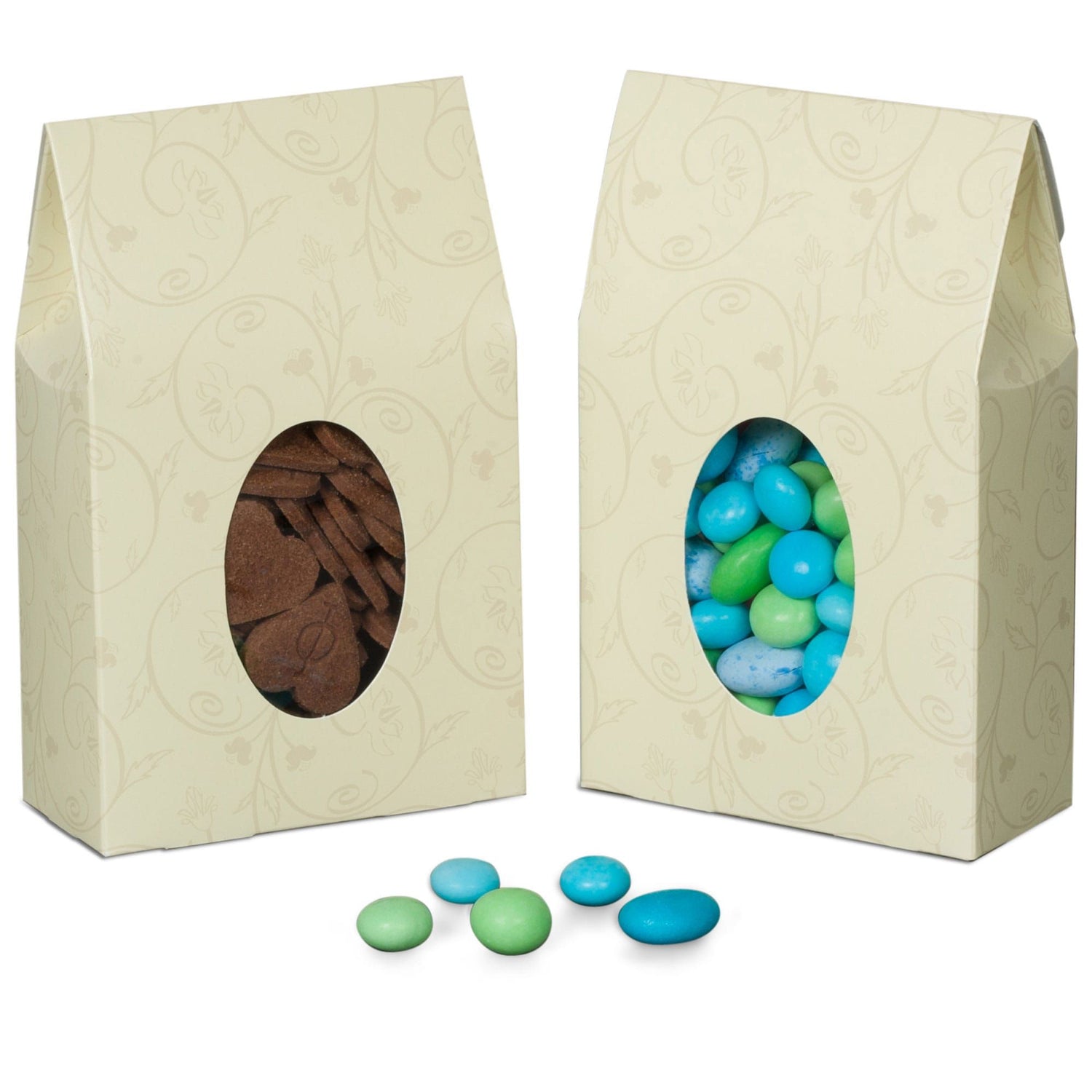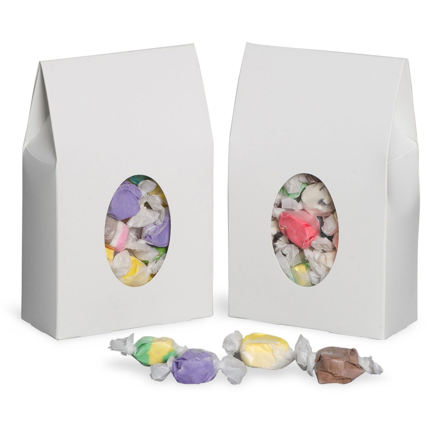 Our Gable Top Boxes are perfect for holding a variety of delicious treats, including cookies, candies, chocolates, or any other snack you can imagine. The oval window on the front of the box provides a peek into the deliciousness inside, tempting whoever sees them to grab a handful of goodies. The gable top design of the box means it tapers at the top.