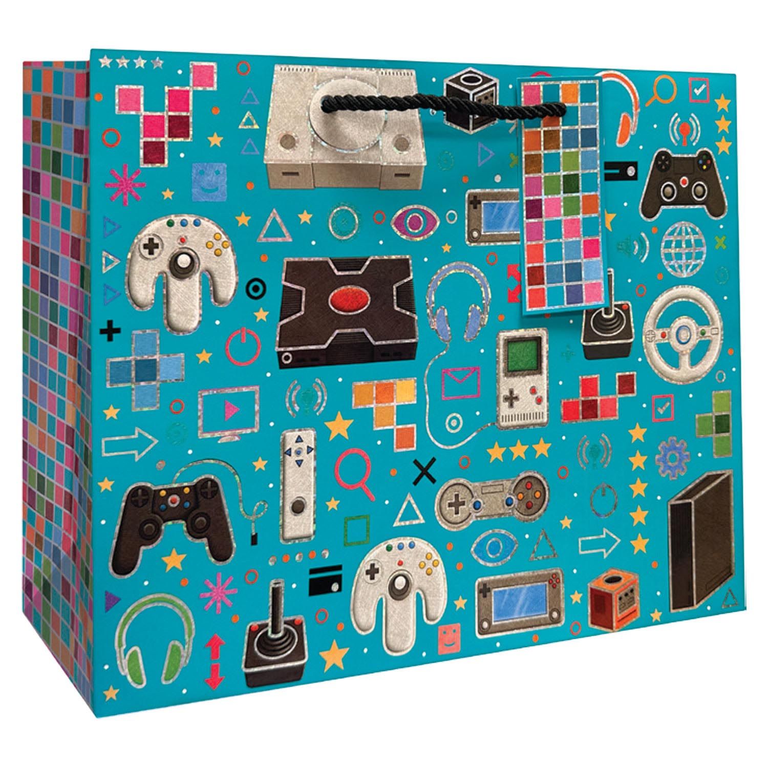Our Gamer's World Collection features Gift Bags, Wrapping Paper, and Tissue in a light blue background with video game controllers, technological symbols, and game systems on the front and back. The matching bag has sides have colorful squares. Great for kids birthday parties and gaming enthusiasts gift giving.