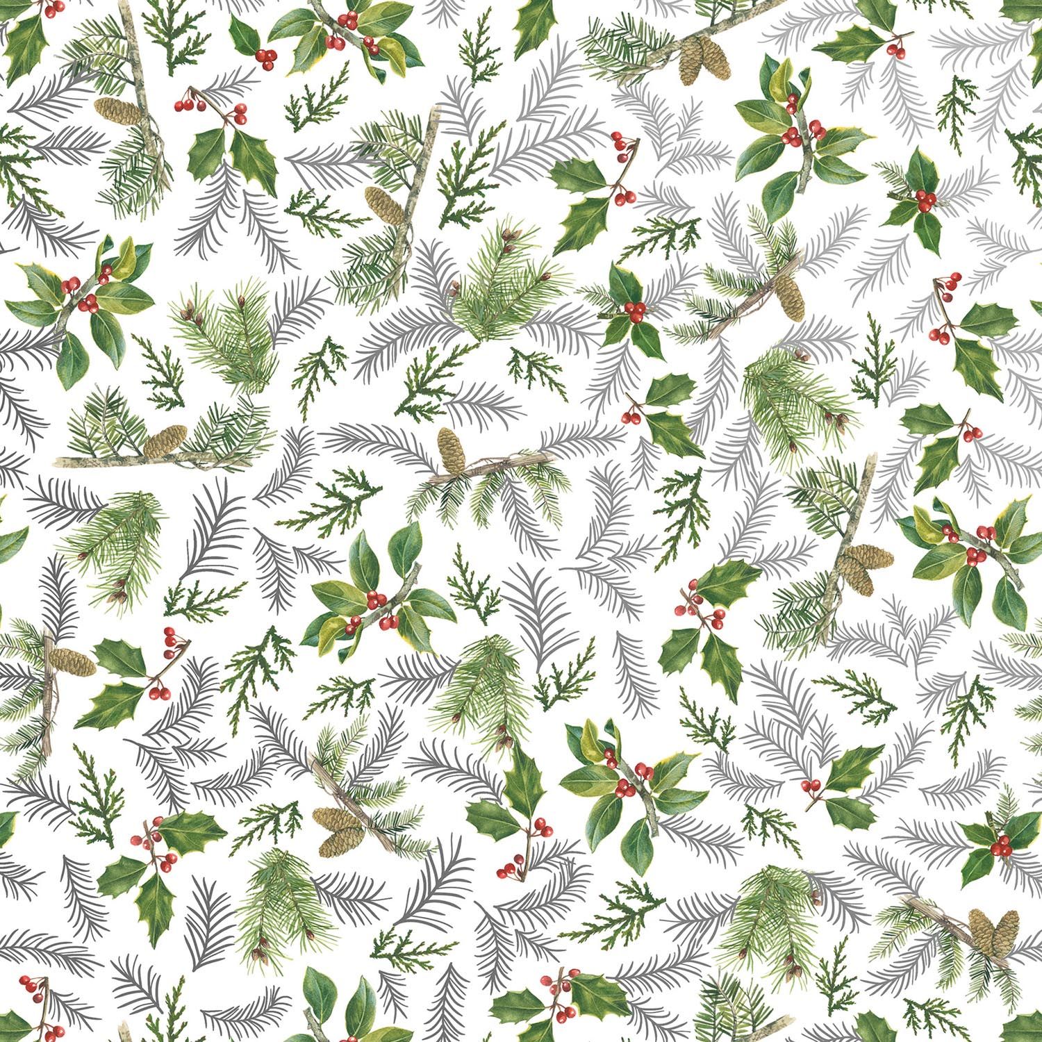 Our Glistening Pine Gift Bags & Wrap Christmas Collection features a festive design featuring realistic evergreen branches adorned with pinecones and holly, set against a light background.