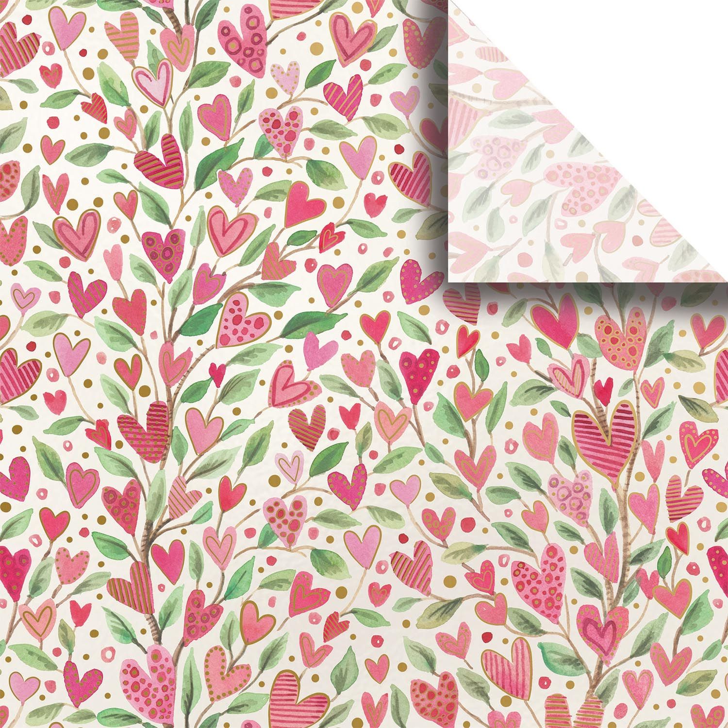 Our Love Grows Valentine Collection features Gift Bags, Wrapping Paper, Shipping Boxes, and Mailers in a white background and a design of pink hearts and green leaves. Our bags also feature matte, foils, embossing, and an inside print.