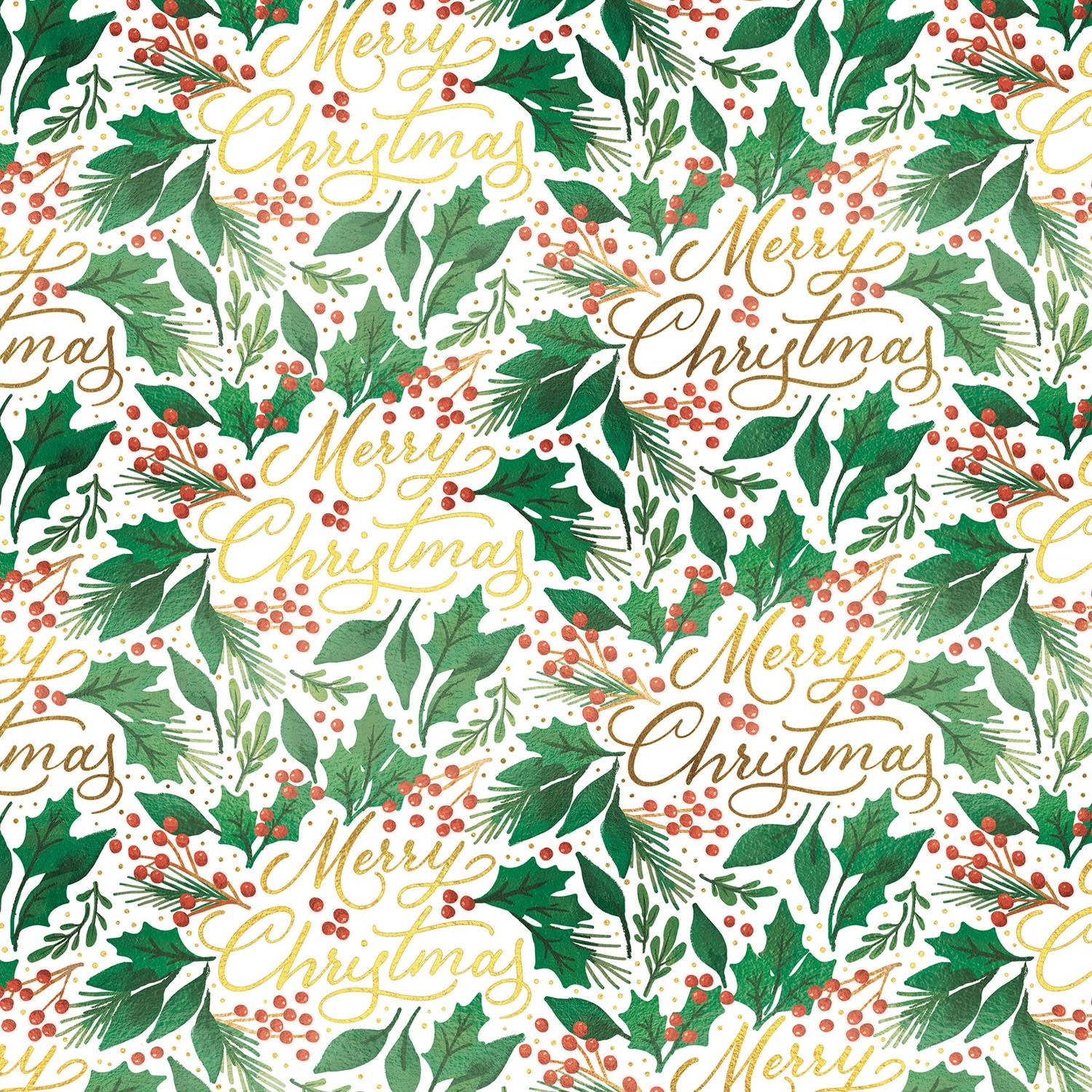 Our Merry Christmas Gift Bags & Wrap Christmas Collection features a red background featuring "Merry Christmas" in elegant gold lettering surrounded by holly, berries, and festive greenery.