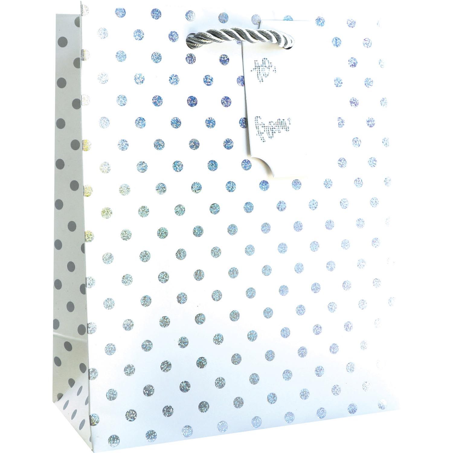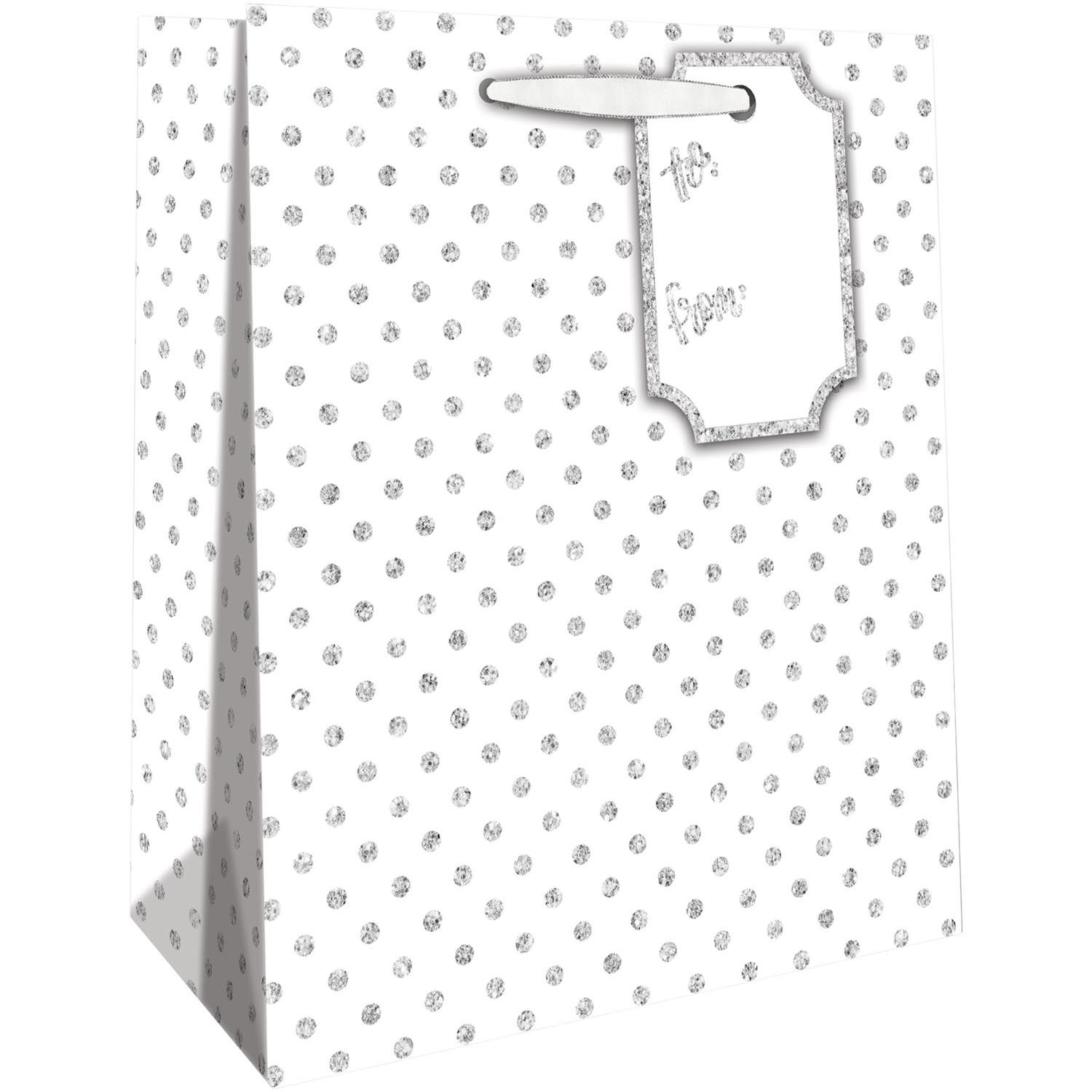 Our Silver Dots on White Collection features Gift Bags, Wrapping Paper, and Tissue in a design of a white background and silver dots. The matching bags feature matte, holographic, and an inside print.